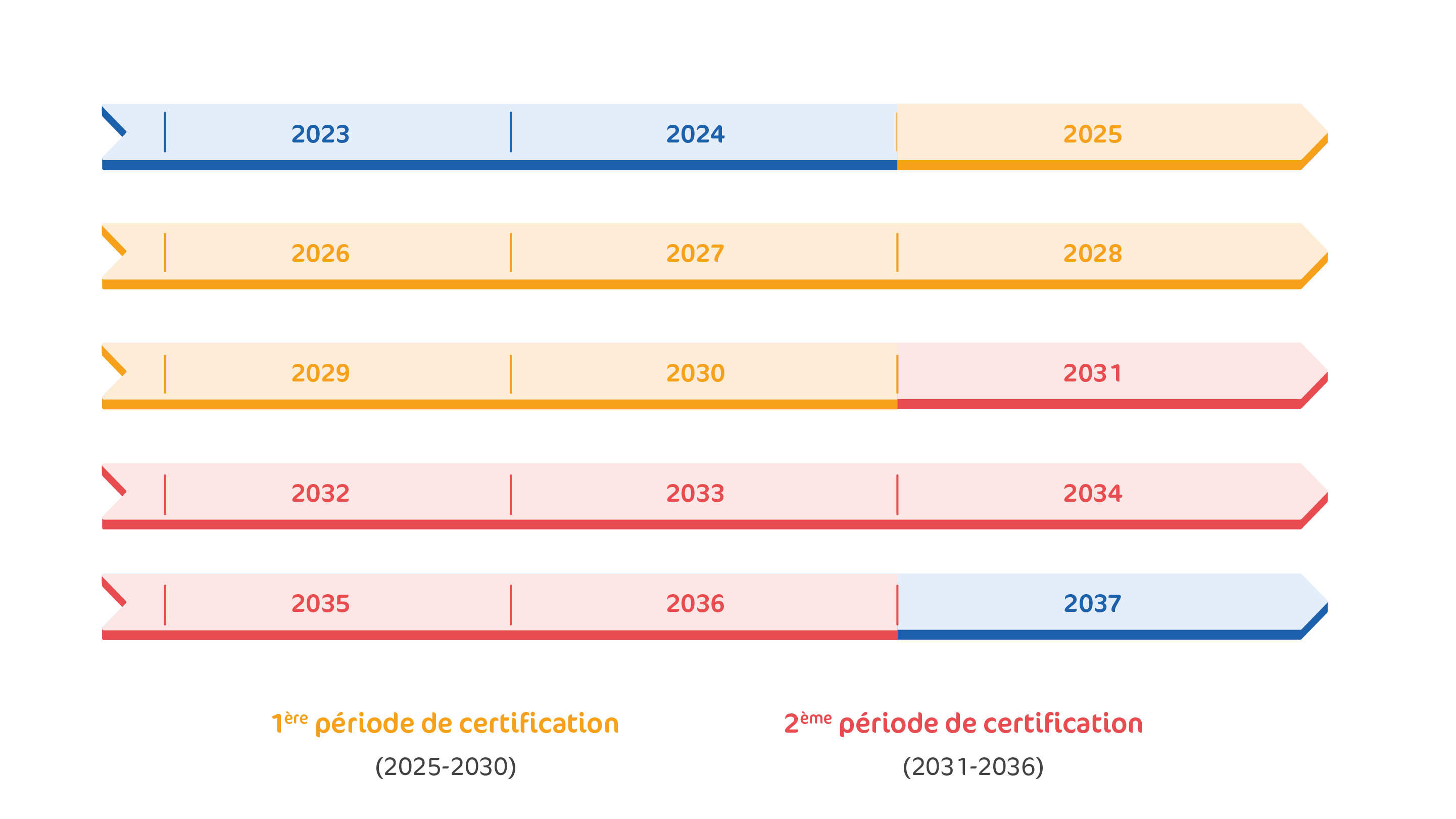 Après cette première période, la certification périodique se fera sur une période de 6 ans pour tous les médecins : 2032-2037 (2ème période), 2038-2043 (3ème période), …